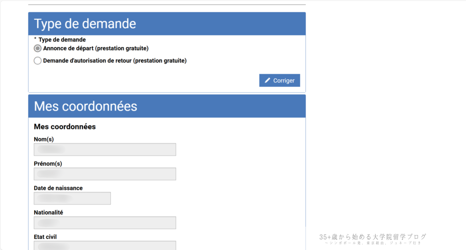 ここでは、これまで入力した内容(申請の種類・個人情報・住所・退去日・転出先住所など)が一覧で表示されます。誤りがあれば、右側の「Corriger(修正)」ボタンから戻って修正可能です。