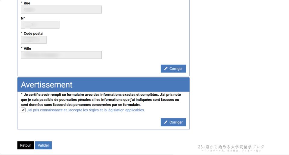 ここでは、入力した内容が正確であることを確認するための宣誓文が表示されます。フランス語で以下のように書かれています。