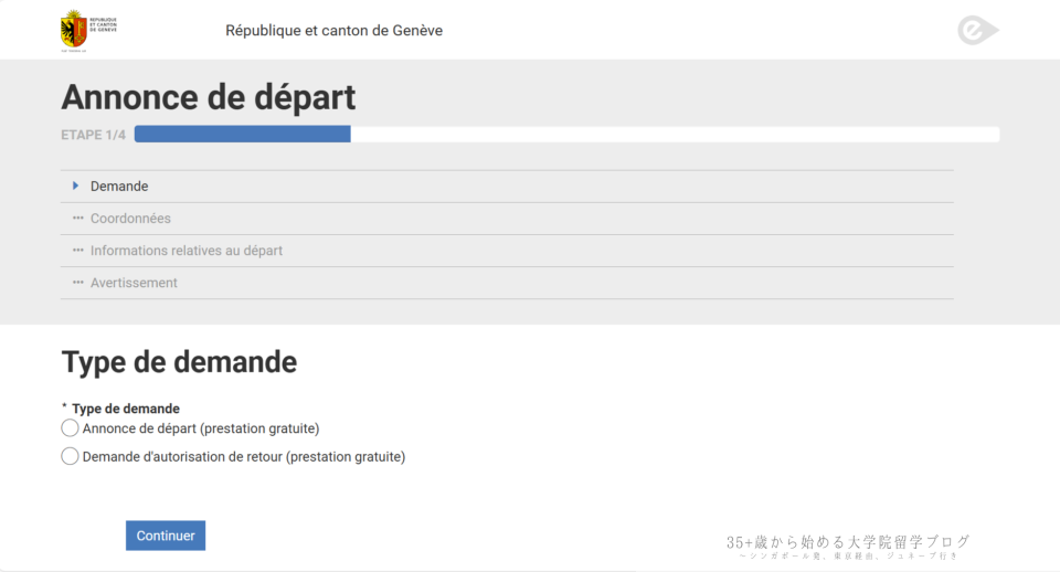 完全にスイスを離れる場合は「Annonce de départ」を選択し、「Continuer(続ける)」を押して次へ。