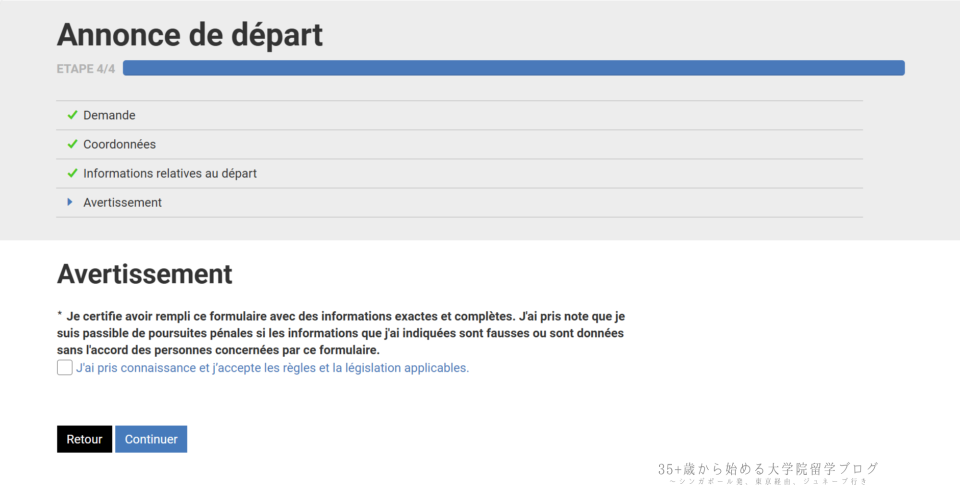 画面下部には再び「Avertissement(注意事項)」が表示されており、「J’ai pris connaissance et j’accepte les règles et la législation applicables.」(規則および法律を理解し、同意します)のチェックボックスを入れる必要があります。