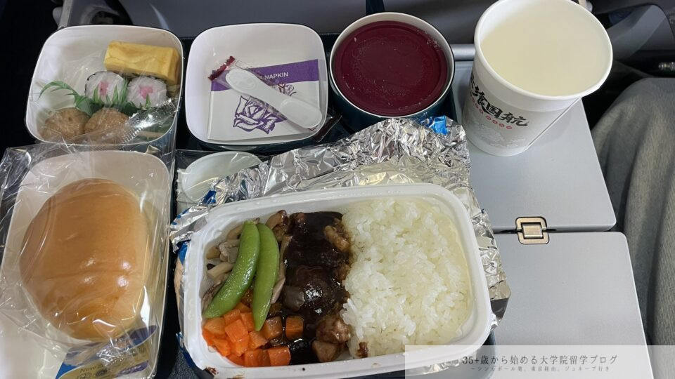 量は全体的に十分でパンやデザートも付いており、エコノミークラスの機内食としては満足度が高いと感じました。