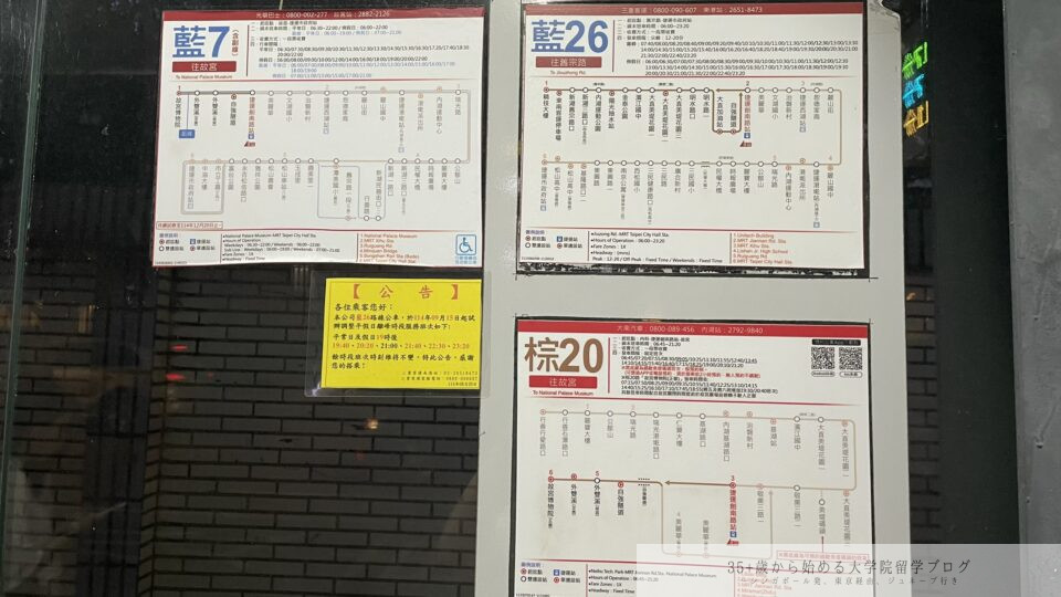 故宮博物院(正館)バス停から出る2本のバス路線についてはB1のインフォメーションカウンターに時刻表があるので参考に。