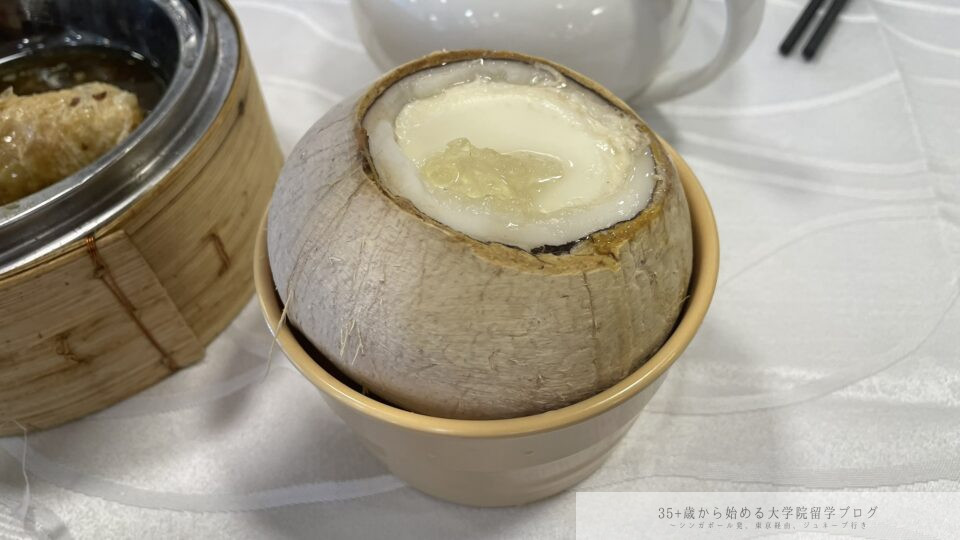 ココナッツの中にミルクプリンが入っています。上に乗っているのはツバメの巣らしいです。