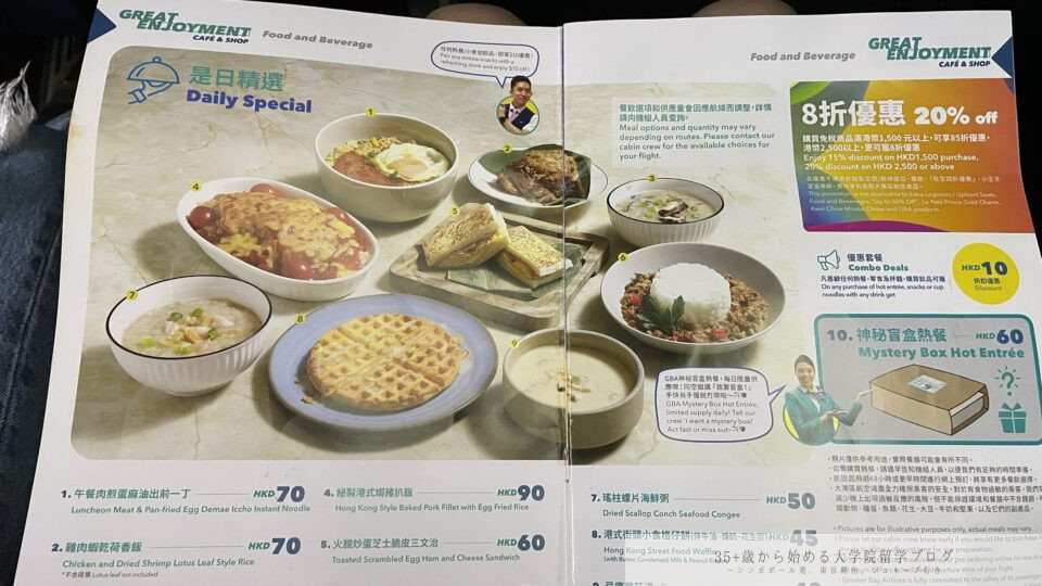 機内食の項目では、香港っぽさが満点の食事メニューが並びます。