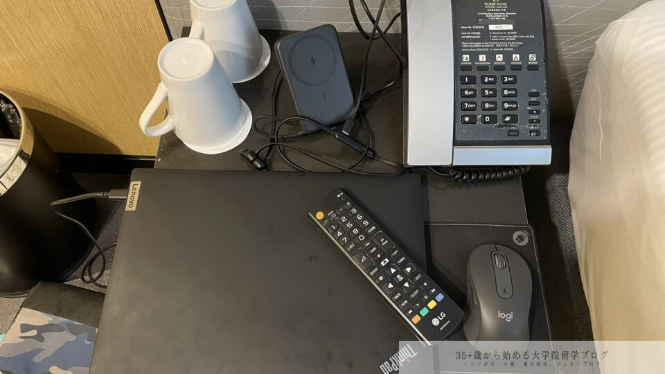 深夜着だったためクレームを言う気力もなく、結局ベッド横の小さなテーブル(湯沸かしポットやら電話が置いてある)で無理やりスペースを作って作業する形になりました。結局その後もそのままでした。